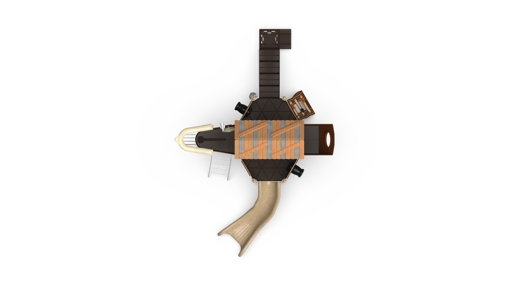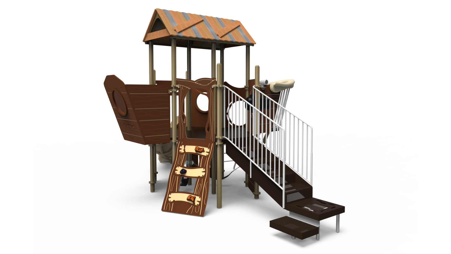 Permission to come aboard and set sail to adventure! This themed ship playground provides hours of pretend fun for children ages 2-5. Activities, climbers and slide add to the excitement.