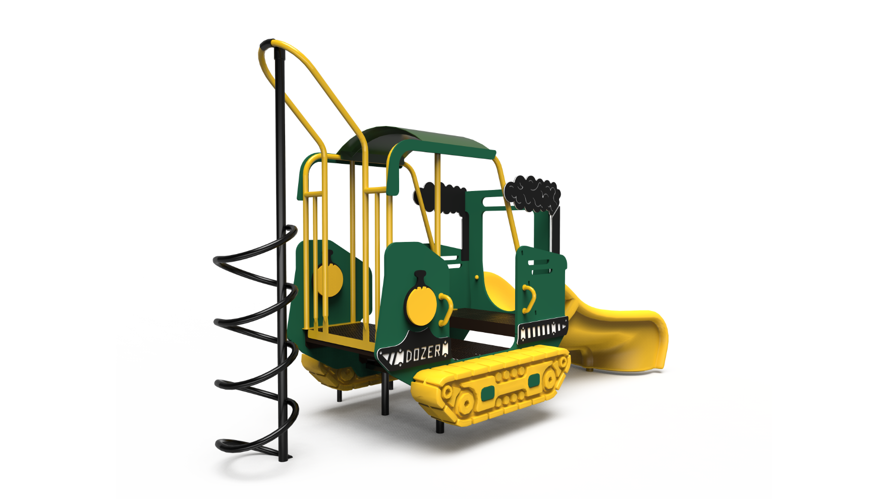 "Design resembles a bull dozer to inspire imaginative play. Accessible slide provides for a fun ride. Challenging spiral climber at rear. Hand grips and transfer platform for user-friendly accessibility. Roof creates shaded play space. The PlayDozer is made of durable steel and plastics, and it can be mounted on an appropriate surface or installed in-ground."&edsp;